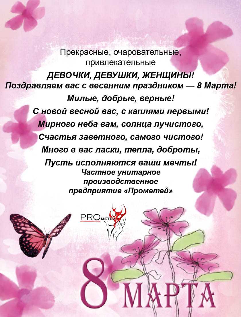 Поздравление с 8 марта от частного унитарного производственного предприятия «Прометей»