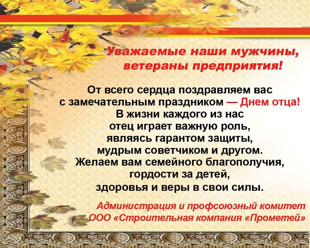 Поздравление с Днем отца от ООО «Строительная компания «Прометей» Gorkinews 21 октября 2023 5:54 Теги Горкидень отцалюдипопуляр Предыдущая новость Следующая новость Поздравление с Днём отца от руководства области Лукашенко: День отца подчеркивает особую роль мужчин в укреплении традиционной белорусской семьи