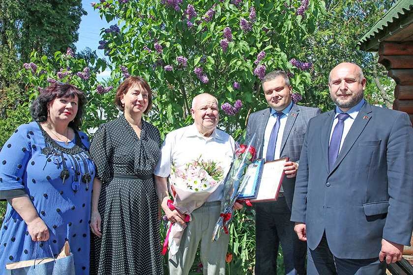 Домой к Михаилу Михайловичу в этот праздничный для него день с наградами, подарками, цветами и самыми теплыми словами поздравлений приехали первый заместитель председателя райисполкома – начальник управления по сельскому хозяйству и продовольствию Андрей Саланинка, председатель районного Совета депутатов и районной организации РОО «Белая Русь» Максим Потапенко, управляющий делами райисполкома Наталья Ковалева, председатель райкома профсоюза работников агропромышленного комплекса Елена Чаплыгина.