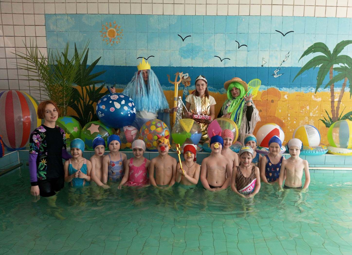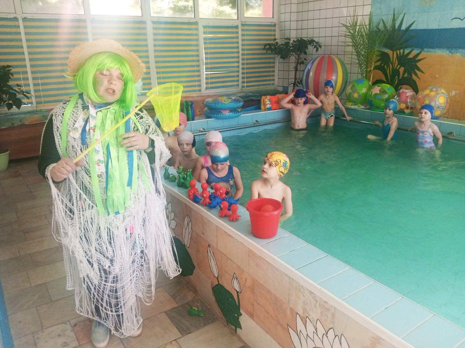 Активности с водой внесли в праздник еще больше веселья, задора и смеха. Например, Буратино разбросал свои золотые монеты по дну бассейна и попросил ребят помочь их достать. Золотая рыбка исполняла желания Нептуна, который хотел увидеть смелость, ловкость и быстроту участников. Ребята участвовали в эстафетах «Рыбка в аквариуме» и «Быстрый мяч». Водяной сразу привлек внимание детей своим спортивным духом, они с радостью помогли очистить пруд от мусора и найти новых друзей: «медузок» и «морских коньков».