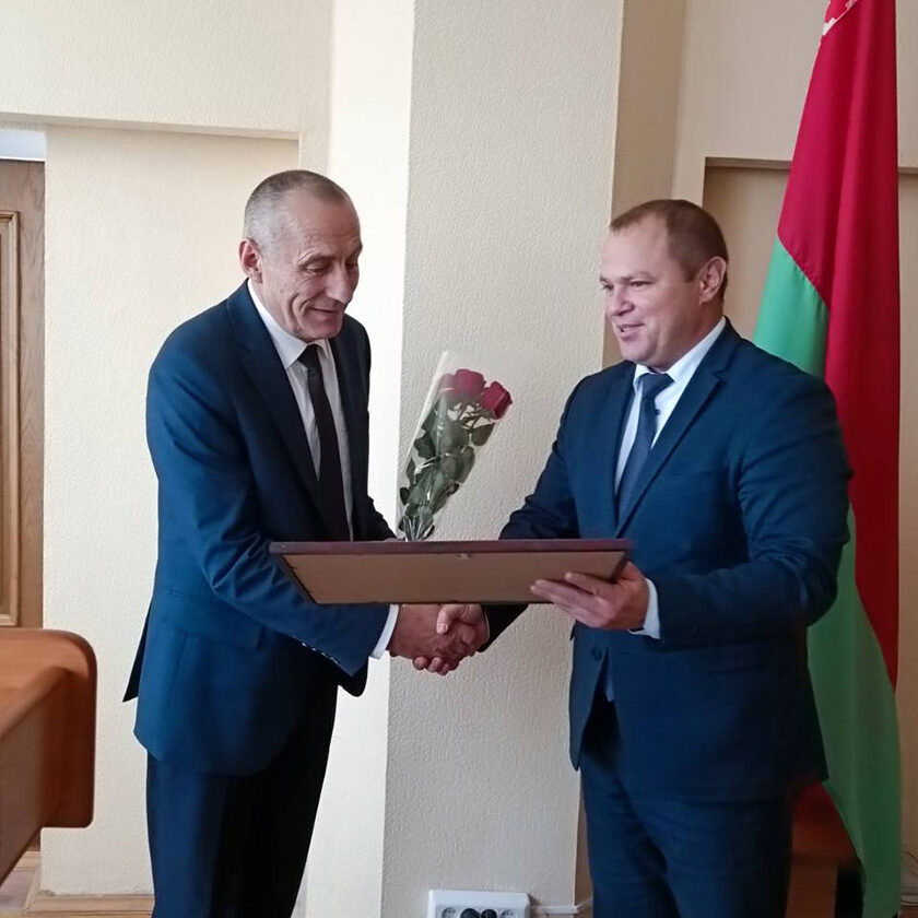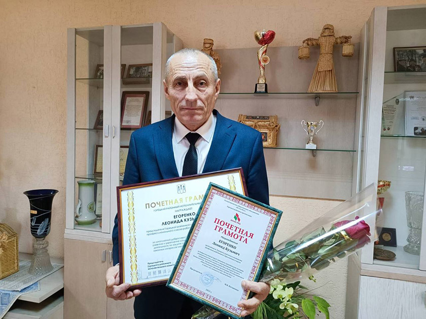 За многолетний добросовестный труд, значительный вклад в развитие и укрепление социального партнерства, активную деятельность по защите социально-экономических прав и законных интересов членов профсоюза председатель райисполкома Михаил Гулый вручил Леониду Егоренко Почетную грамоту районного исполнительного комитета.