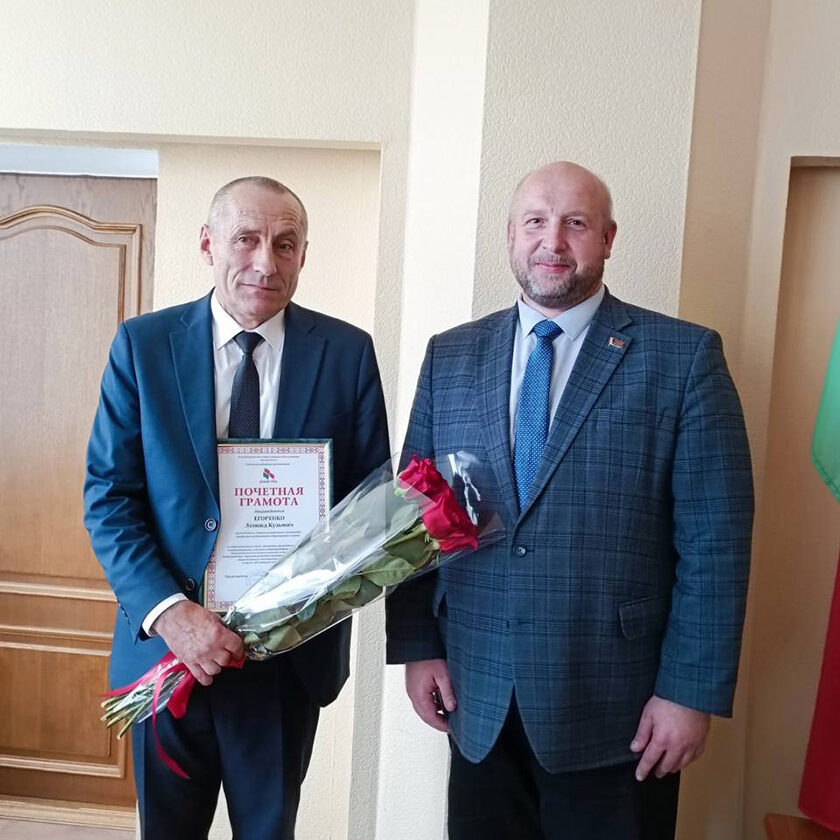 Председатель районного Совета депутатов Максим Потапенко наградил Леонида Кузьмича Почетной грамотой РОО «Белая Русь» за активную гражданскую позицию, инициативность, участие в мероприятиях общественно-патриотической направленности и большой вклад в деятельность этой общественной организации.