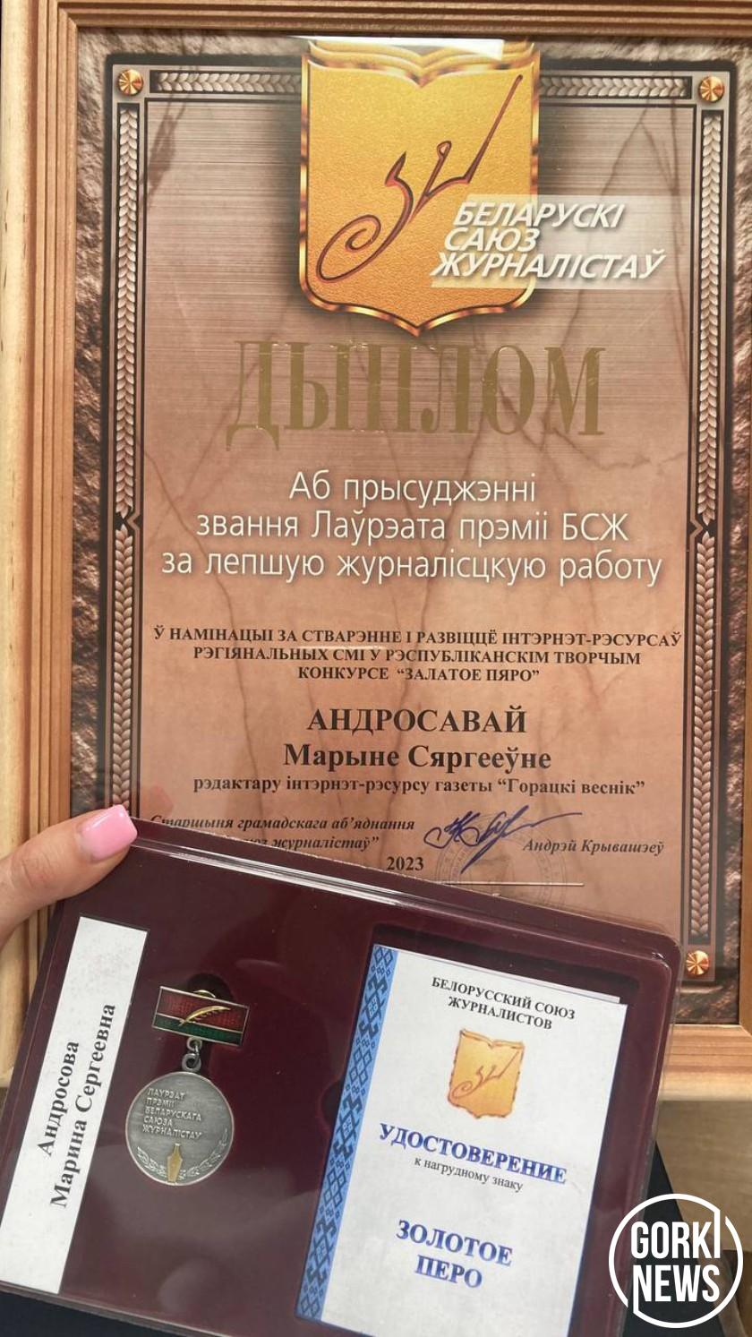 В Минске Белорусский союз журналистов объявил победителей республиканского творческого конкурса «Золотое перо». Коллектив редакции «Горецкий вестник» стал лауреатом премии БСЖ за лучшую журналистскую работу в номинации «За создание и развитие интернет-ресурсов региональных СМИ». Ее вручили редактору интернет-ресурса Марине Андросовой.