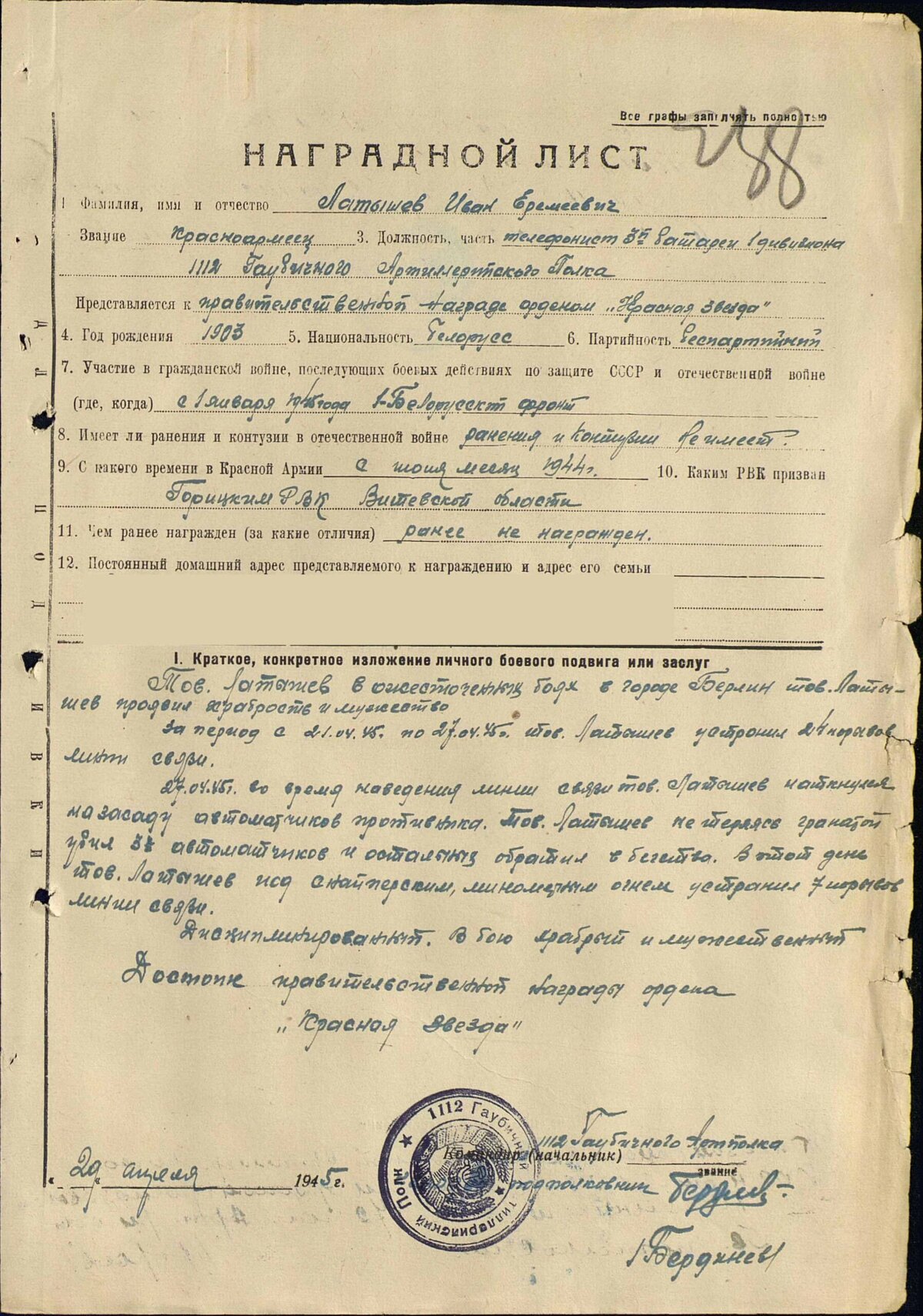 В наградном листе к ордену Красной Звезды за номером 1610505, сказано следующее: «Товарищ Латышев в ожесточенных боях в городе Берлин проявил храбрость и мужество. За период с 21.04.1945 г. по 27.04.1945 г. тов. Латышев устранил 24 порыва линии связи. 27.04.1945 г. во время наведения линии связи тов. Латышев наткнулся на засаду автоматчиков противника. Тов. Латышев, не теряясь, гранатой убил 3-х автоматчиков и остальных обратил в бегство. В этот день тов. Латышев под снайперским, минометным огнем устранил 7 порывов линии связи. Дисциплинированный. В бою храбрый и мужественный. Достоин правительственной награды ордена «Красной Звезды».