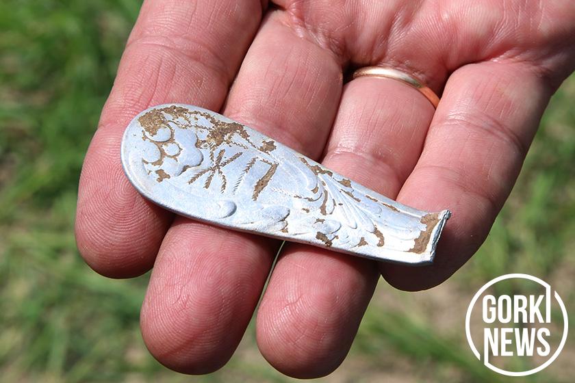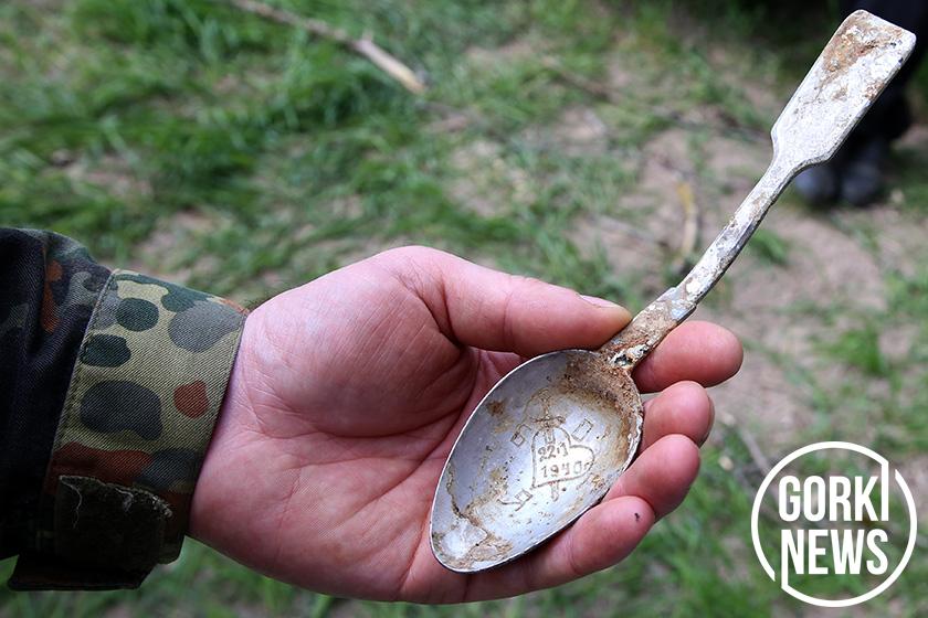 Поскольку в Горках пока нет организации, которая целенаправленно занимается поиском неизвестных захоронений красноармейцев и жертв войны, Алексей Персиков обратился к руководителю клуба «Виккру» Николаю Борисенко. В августе 2022 года на опушке леса возле поля вблизи д. Гулидовкапровели разведку и с помощью специальных приборов и металлодетектеров определили, что в воронке от авиабомбы есть останки людей. По предварительным расчетам, думали найти троих. Тогда же была найдена ложка с инициалами Ж. П. и сердцем, пробитым мечом. «Это так называемое окопное творчество. Во время отдыха бойцы гвоздями подписывали свои вещи, ножи, амуницию», — показывает раритет Владислав Степанцов.