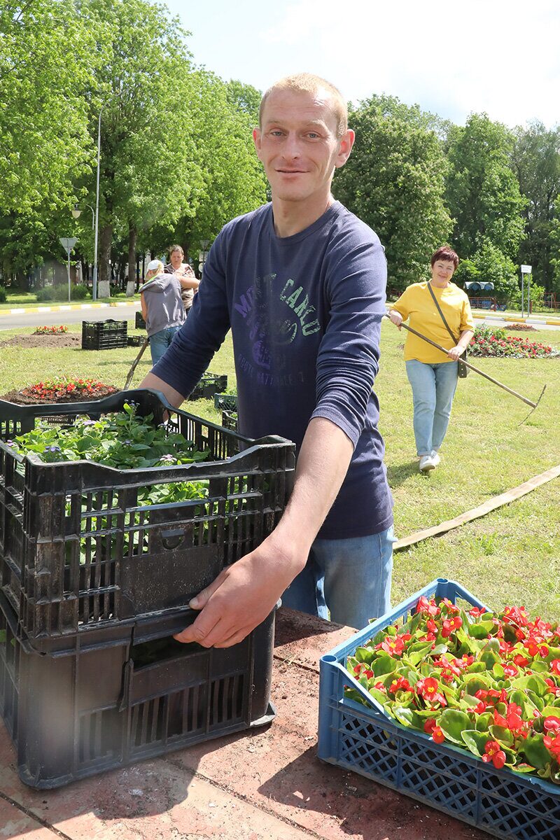 Работники УКПП «Коммунальник» высаживают цветы на пересечении ул. Тимирязева и ул. Бруцеро-Ерофеевской пр-та Интернационального.