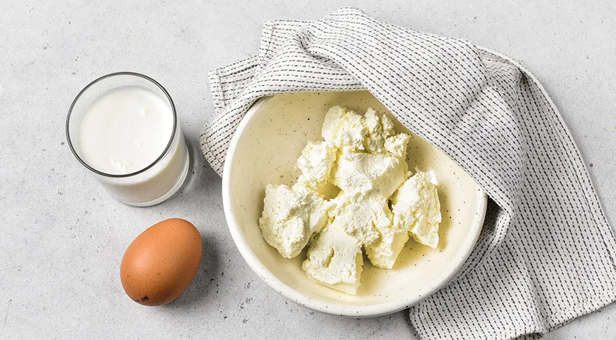 Заранее выньте из холодильника творог, кефир и яйцо и дайте им постоять при комнатной температуре и немного нагреться. Если у вас рассыпчатый творог, то его лучше протереть через сито, чтобы у творожных оладий на кефире была воздушная текстура.