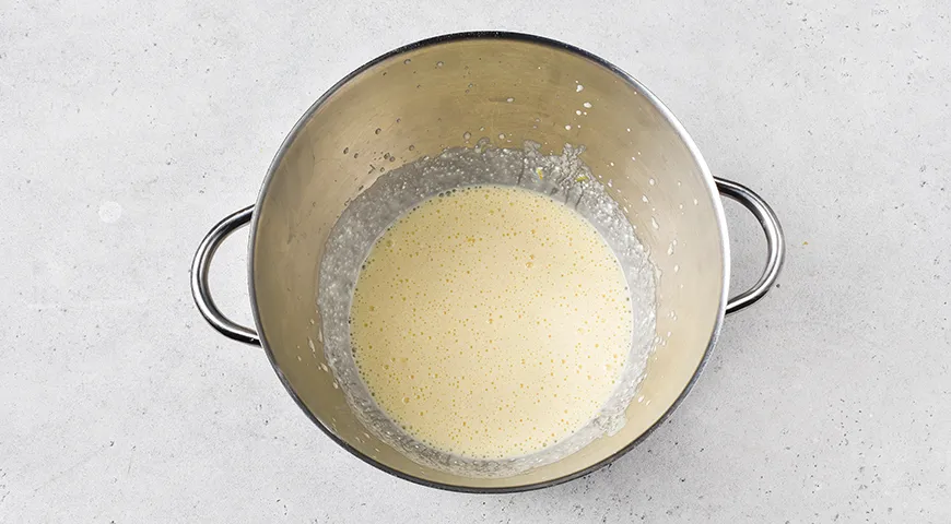 Смешайте вилкой в миске кефир и яйцо. Добавьте творог, сахар с цедрой лимона, щепотку соли и погашенную соду (если используете ее вместо разрыхлителя), перемешайте ложкой или венчиком до образования однородной массы без комочков.
