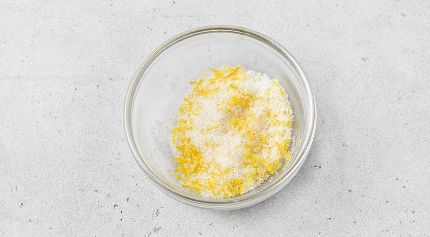 Из половинки лимона натрите цедру на мелкой терке. Положите цедру в пиалу и смешайте с 2 ст. л. сахара. Накройте пленкой и дайте постоять, чтобы сахар пропитался ароматом цедры. Если вместо разрыхлителя берете соду, положите ее в большую ложку и капните соком лимона, чтобы погасить.