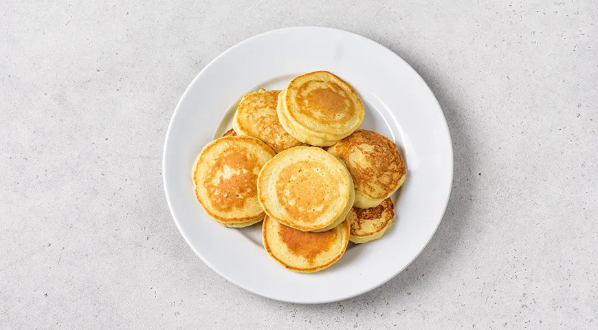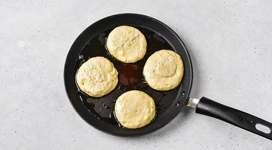 Разогрейте на огне сковороду для блинов, смажьте ее с помощью кисточки растительным маслом. Ложкой выкладывайте тесто на сковороду в форме небольших оладий. Жарьте на умеренном огне сначала с одной стороны, 2‒3 минуты.