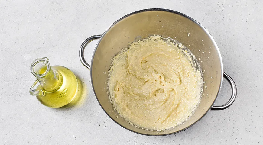 В миску с творожной массой аккуратно просейте муку с разрыхлителем. перемешайте. Добавьте в тесто растительное масло, снова перемешайте до однородности. У вас должно получиться крутое тесто для оладий из творога и кефира.