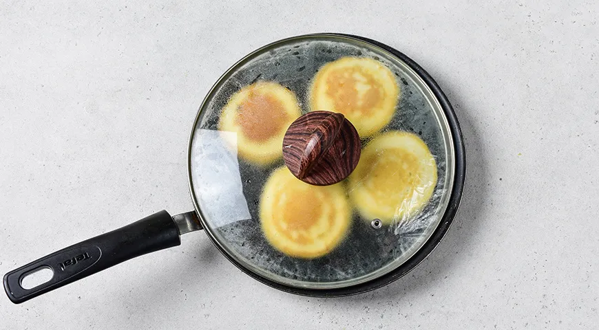 Когда верх у оладий схватится и не будет сырым, переверните их лопаткой на другую сторону. Накройте сковороду крышкой и готовьте на тихом огне еще 3 минуты. Под крышкой творожные оладьи на кефире поднимутся и станут пышными.
