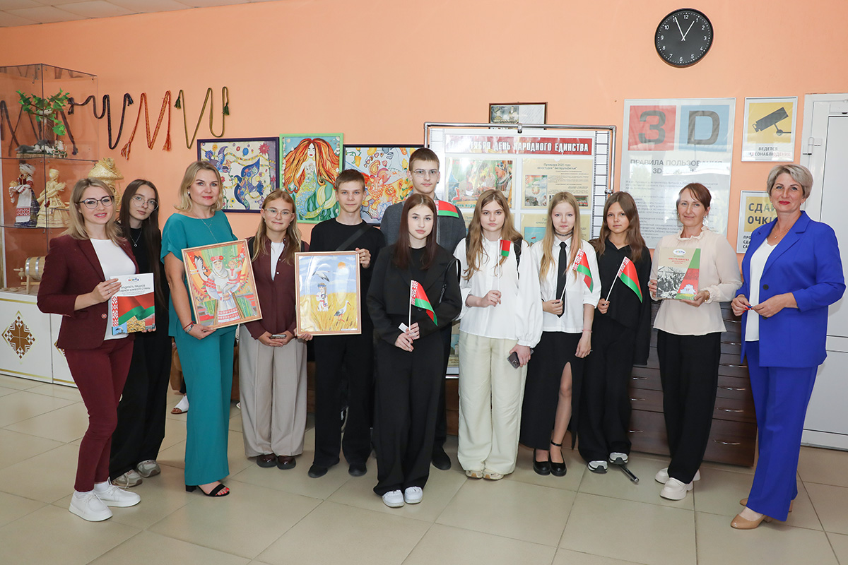 Тематическую литературную экспозицию «Для нас единство наше свято» представила Горецкая районная библиотечная сеть. Методист отдела маркетинга и социокультурной деятельности Ольга Максимова познакомила с материалами о национальной истории и объяснила детям смысл государственных символов, а также с историей флага и герба.