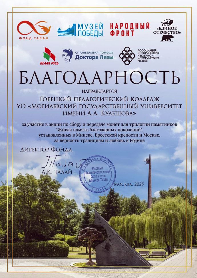 Горецкий педагогический колледж награжден благодарностью благотворительного фонда Алексея Талая за участие в международной акции по сбору и передаче монет для...