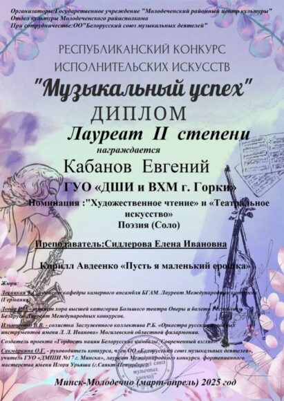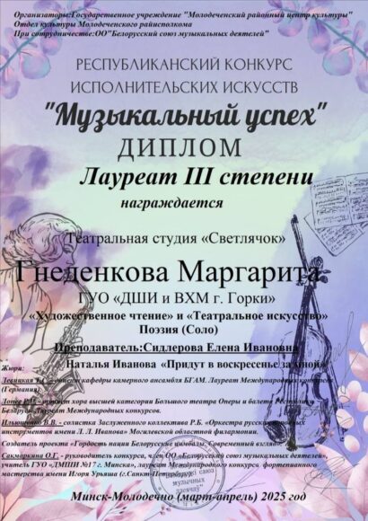 Театральный коллектив «Светлячок» агрогородка Ректа ГУО «Детская школа искусств и вокально-хорового мастерства г. Горки» под руководством Сидлеровой Е.И. с гордостью и радостью сообщает о своих успехах на Республиканском конкурсе исполнительских искусств «Музыкальный успех»