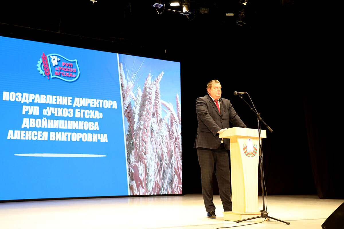 Далее к присутствующим с приветственной речью обратился директор РУП «Учхоз БГСХА» Алексей Двойнишников. Алексей Викторович вкратце рассказал, что собой представляет сельхозпредприятие, отметил его достижения и лучших работников.