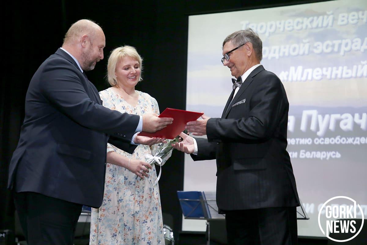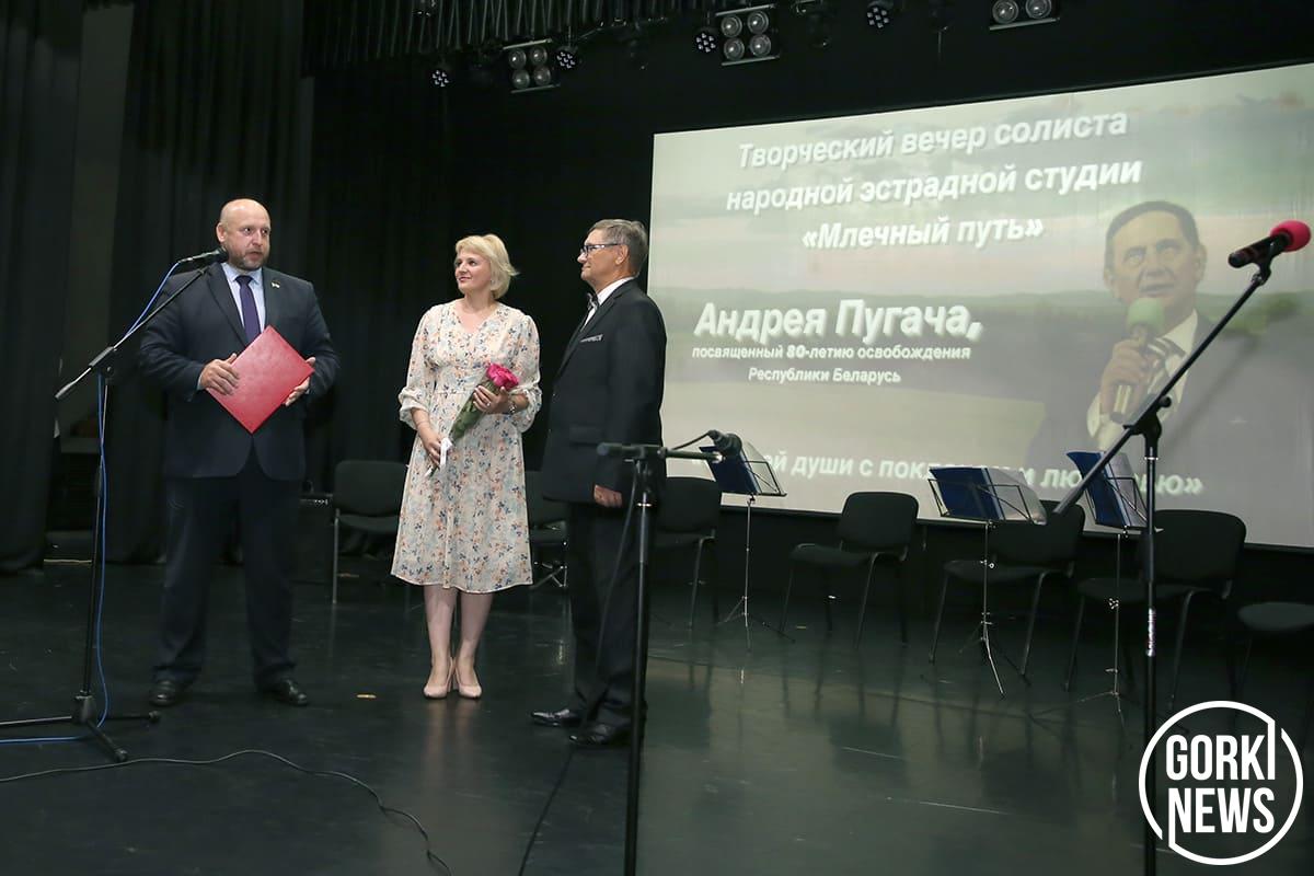 Поздравить Андрея Пугача с 60-летием творческой деятельности пришли председатель районного Совета депутатов Максим Потапенко и заместитель председателя районного исполнительного комитета Лариса Кривицкая. Вручая поздравительный адрес от председателя районного исполнительного комитета Михаила Гулого Максим Валентинович и Лариса Владимировна сказали много теплых добрых слов поздравлений и пожеланий Андрею Михайловичу. «Каждое ваше выступление отличается высоким профессионализмом, глубиной исполнения и уважением к слушателям. …Вы всегда были и остаетесь творческим, увлекающимся человеком, который всю жизнь стремится к совершенствованию и профессиональному росту,» – отмечено в поздравительном адресе.