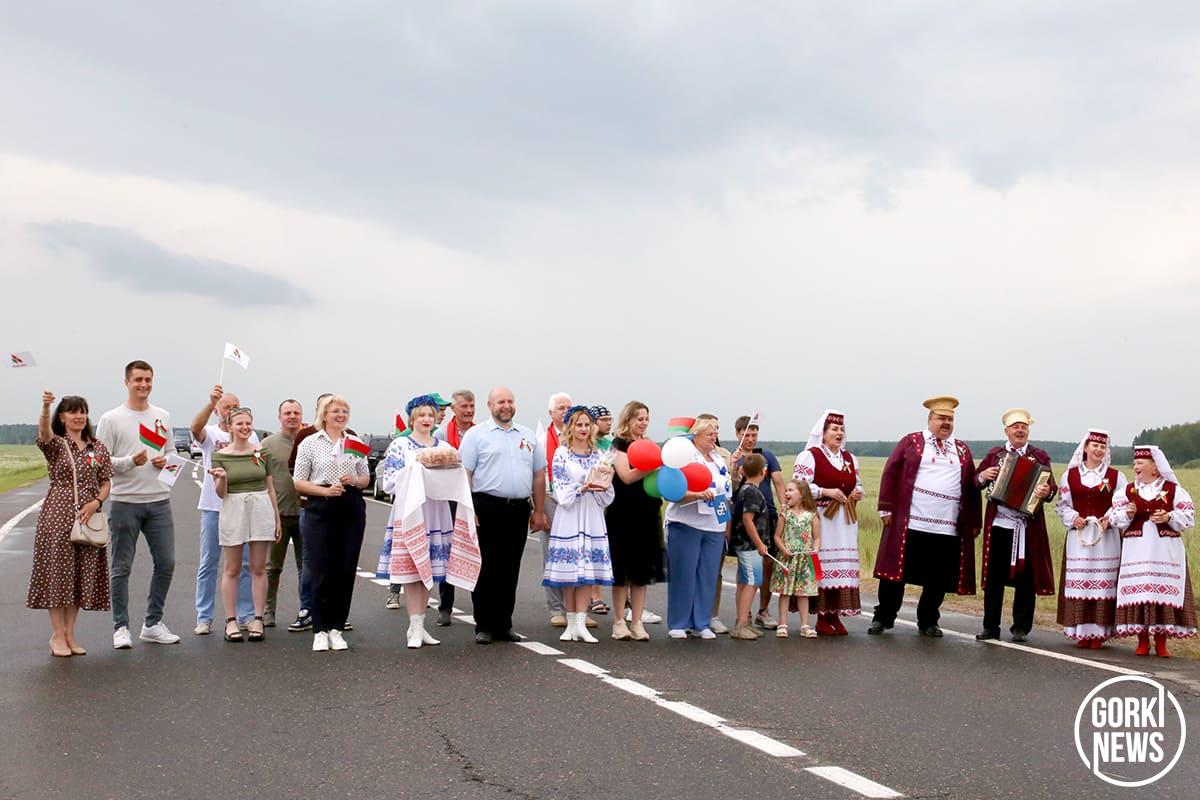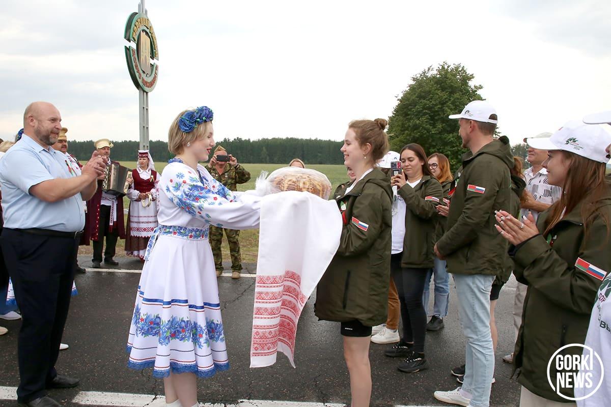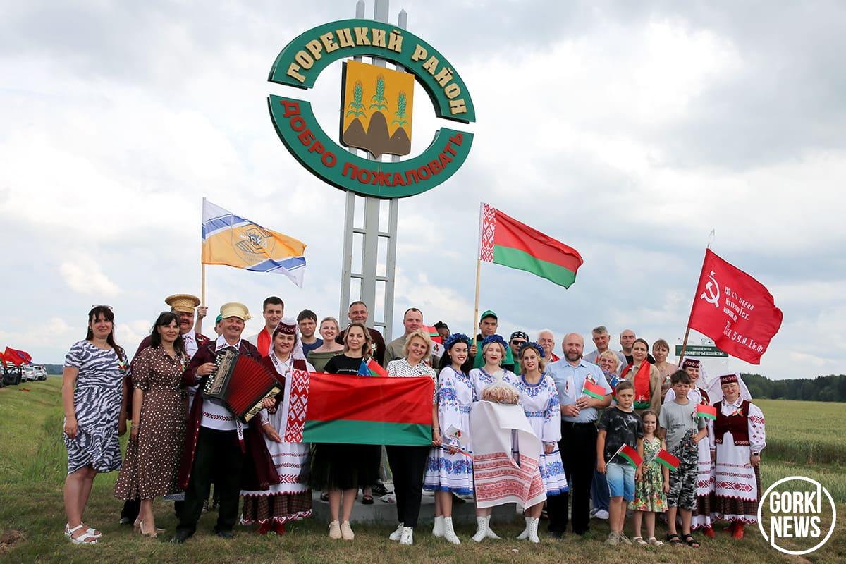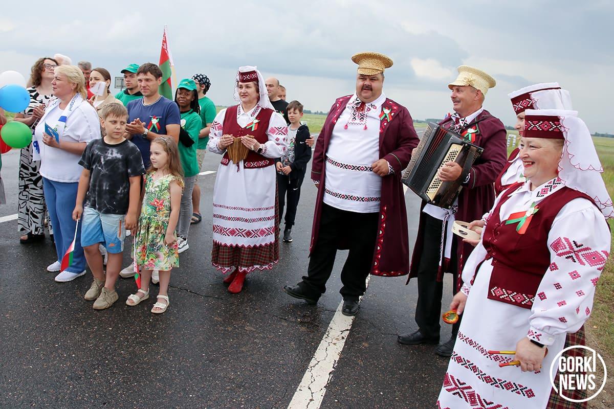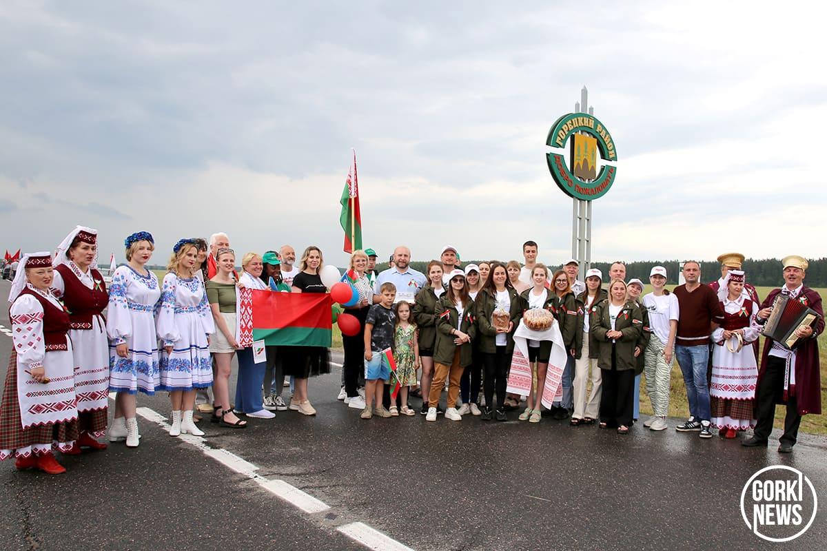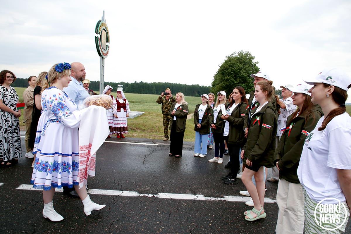 У знака границы нашего района со стороны с соседней Шкловщиной юных патриотов в составе стилизованной, украшенной флагами автоколонны встречали представители власти, депутатского корпуса, общественных организаций и объединений, трудовых коллективов, УО БГСХА, молодежь. Председатель районного Совета депутатов Максим Потапенко, заместитель председателя районного исполнительного комитета Лариса Кривицкая от добродушных жителей хлебосольного гостеприимного Горецкого района вручили дорогим гостям замечательный душистый каравай, а также сувенир от района-юбиляра. Для молодых людей коллектив «Добряночка» исполнил прекрасные тематические композиции «Калі ласка» и «Хлеб ды соль».