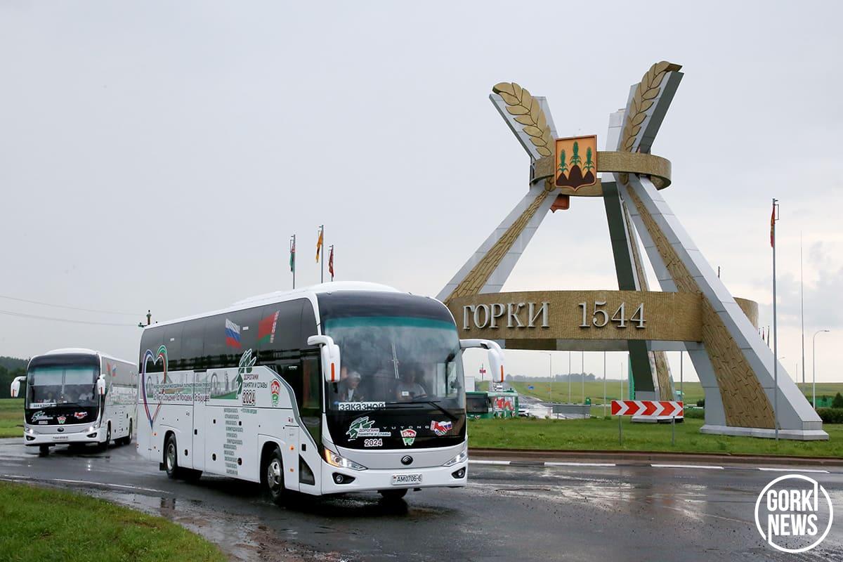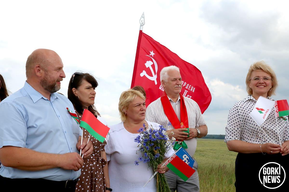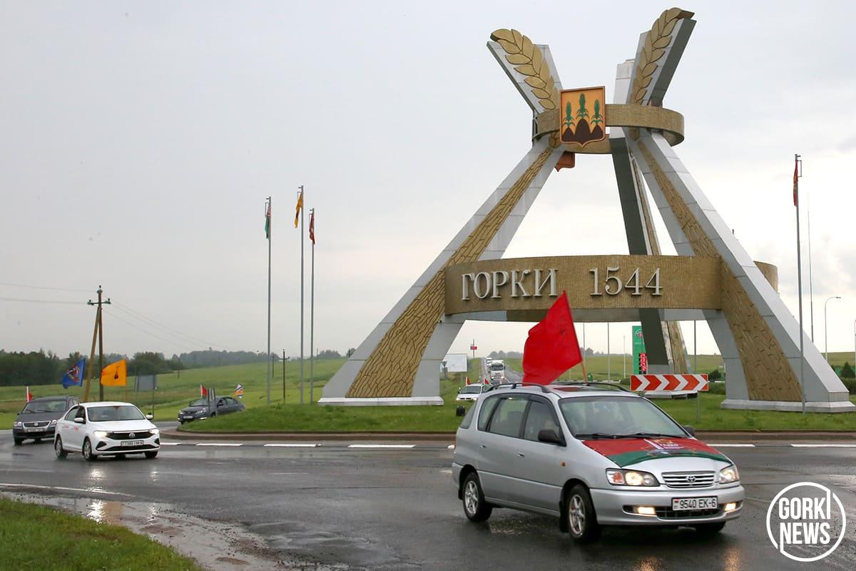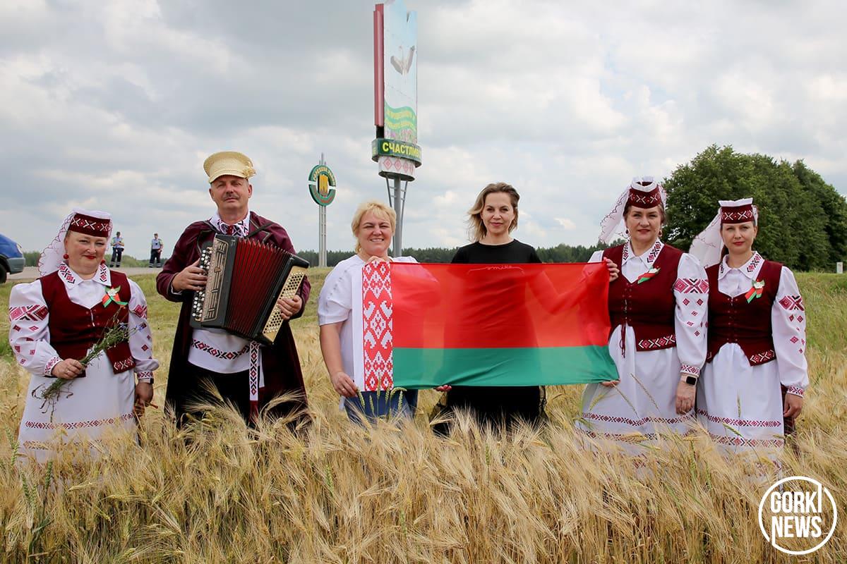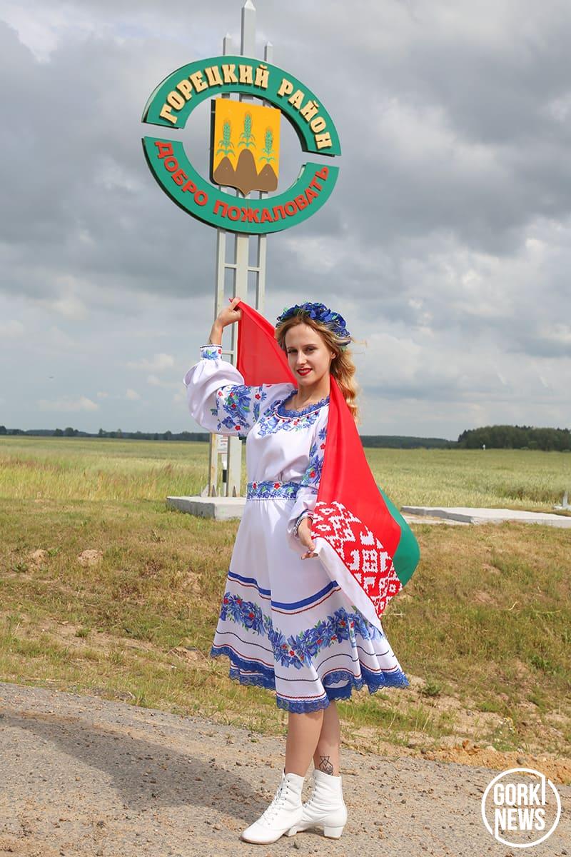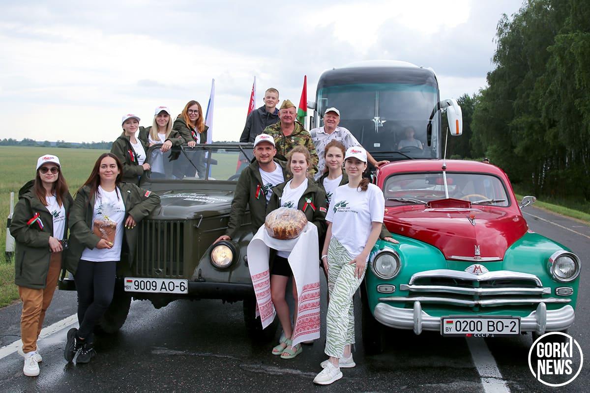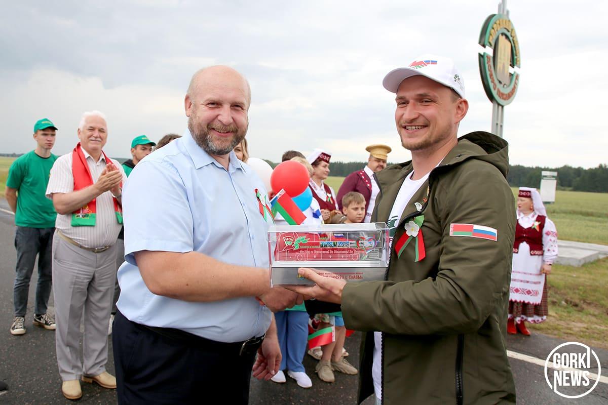 У знака границы нашего района со стороны с соседней Шкловщиной юных патриотов в составе стилизованной, украшенной флагами автоколонны встречали представители власти, депутатского корпуса, общественных организаций и объединений, трудовых коллективов, УО БГСХА, молодежь. Председатель районного Совета депутатов Максим Потапенко, заместитель председателя районного исполнительного комитета Лариса Кривицкая от добродушных жителей хлебосольного гостеприимного Горецкого района вручили дорогим гостям замечательный душистый каравай, а также сувенир от района-юбиляра. Для молодых людей коллектив «Добряночка» исполнил прекрасные тематические композиции «Калі ласка» и «Хлеб ды соль».