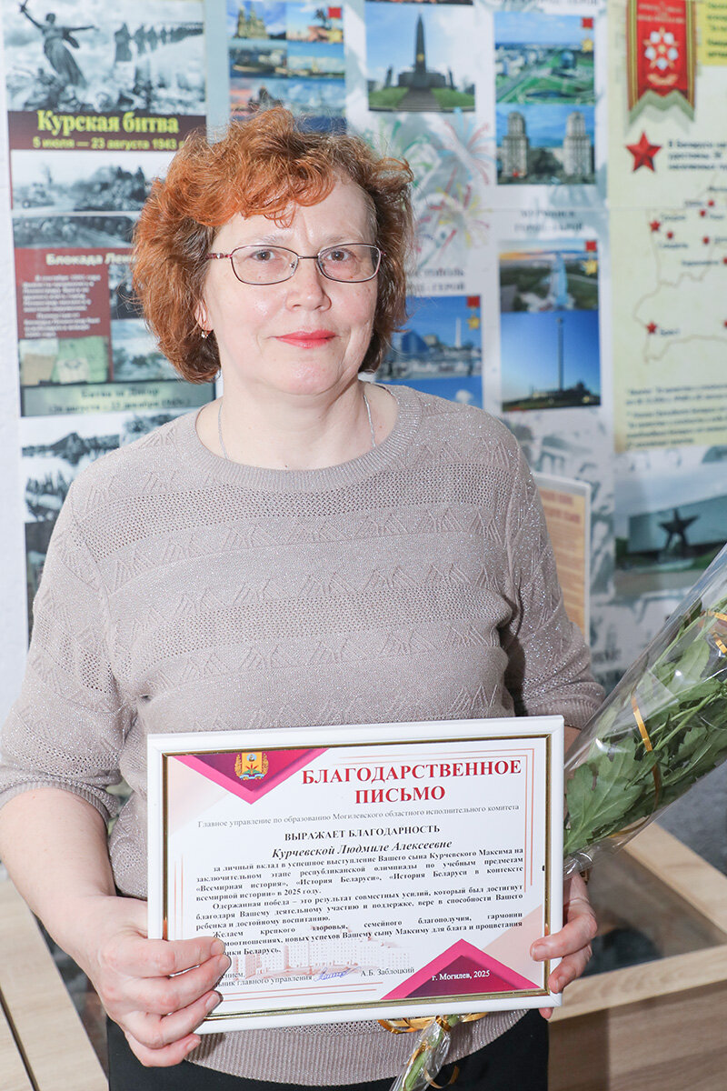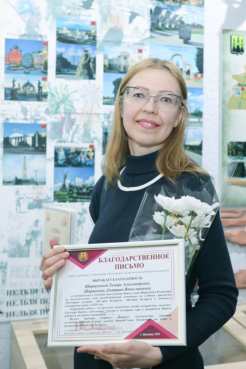 Благодарственные письма главного управления по образованию облисполкома вручили родителям ребят: Людмиле Курчевской, Татьяне Елисеенко, Тамаре Шаршуновой за личный вклад в успешное выступление ребят.