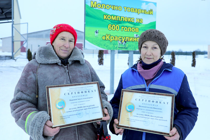 От имени районной профсоюзной организации Елена Чаплыгина поблагодарила работников комплекса за их труд и вручила денежные сертификаты оператору по доращиванию молодняка Светлане Шалаевой и оператору машинного доения Анжеле Пыркиной.