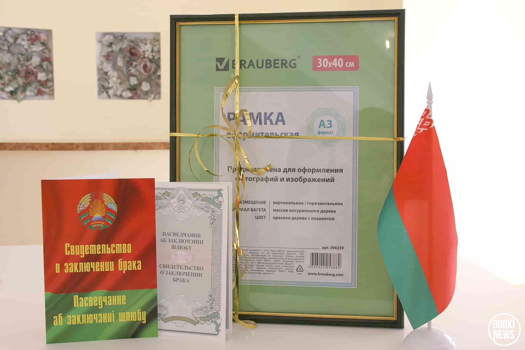 Церемонию провела начальник отдела ЗАГС Горецкого райисполкома Наталья Мелехова. Она поздравила пару и вручила не только свидетельство о заключении брака, а также подарок в виде рамки для оформления фотографий и изображений.