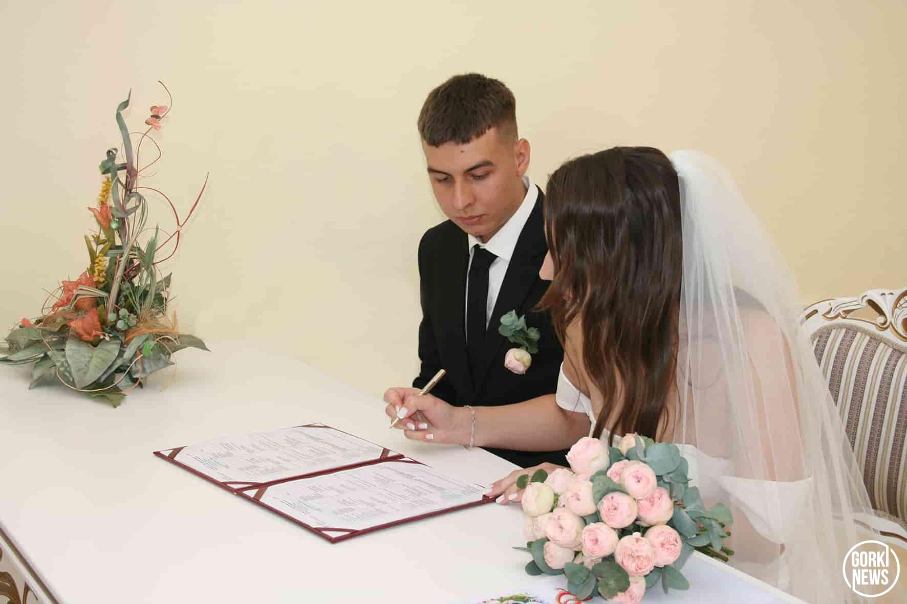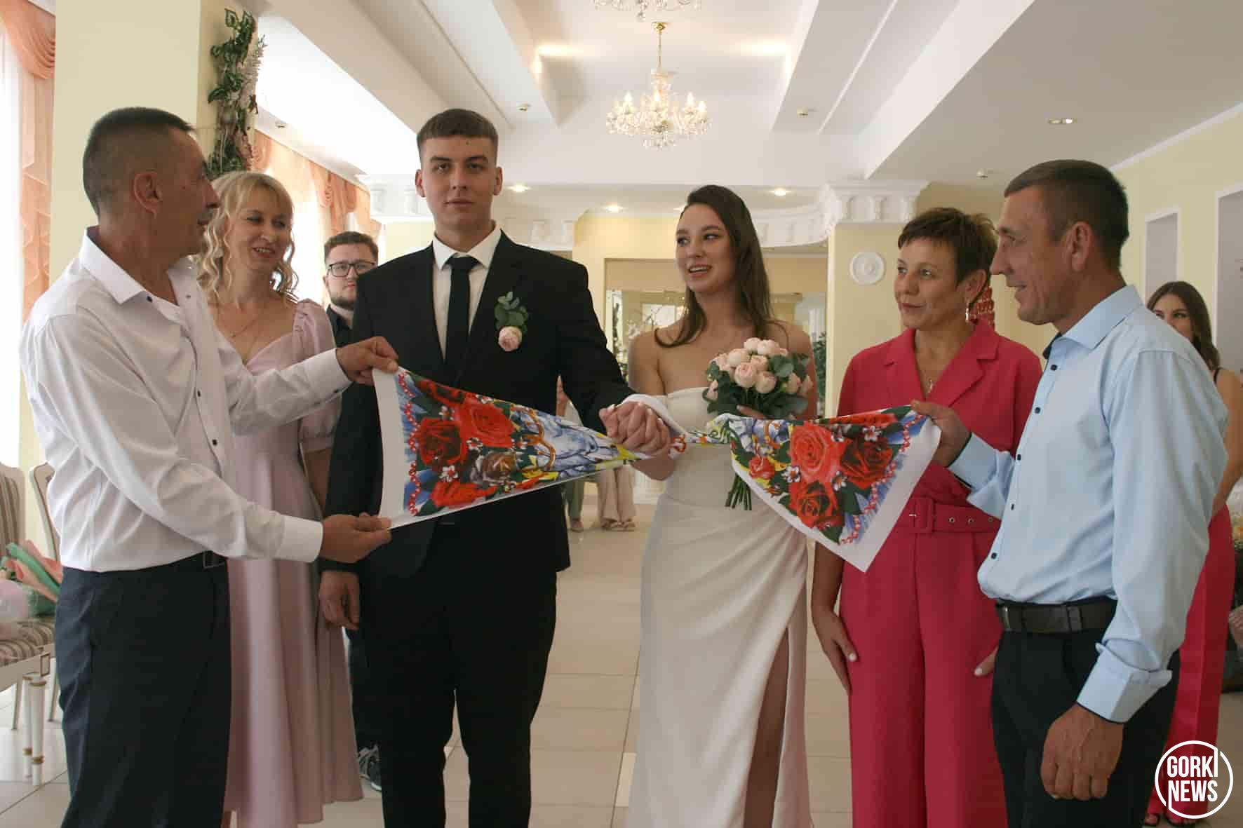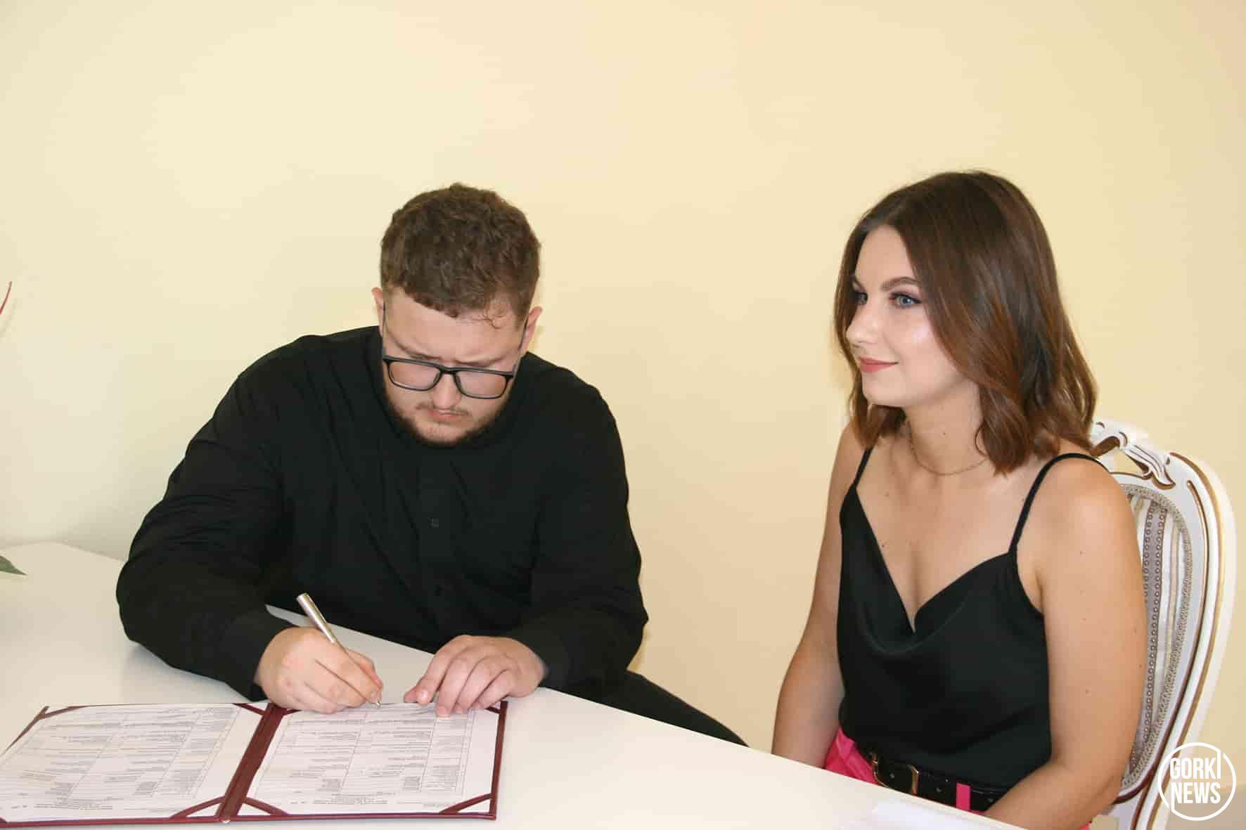 Юбилейная свадьба прошла сегодня в отделе ЗАГС райисполкома. Это сотая новая молодая семья в Горецком районе. Молодоженами стали Ярослав Кабашов и Ксения Цыркунова