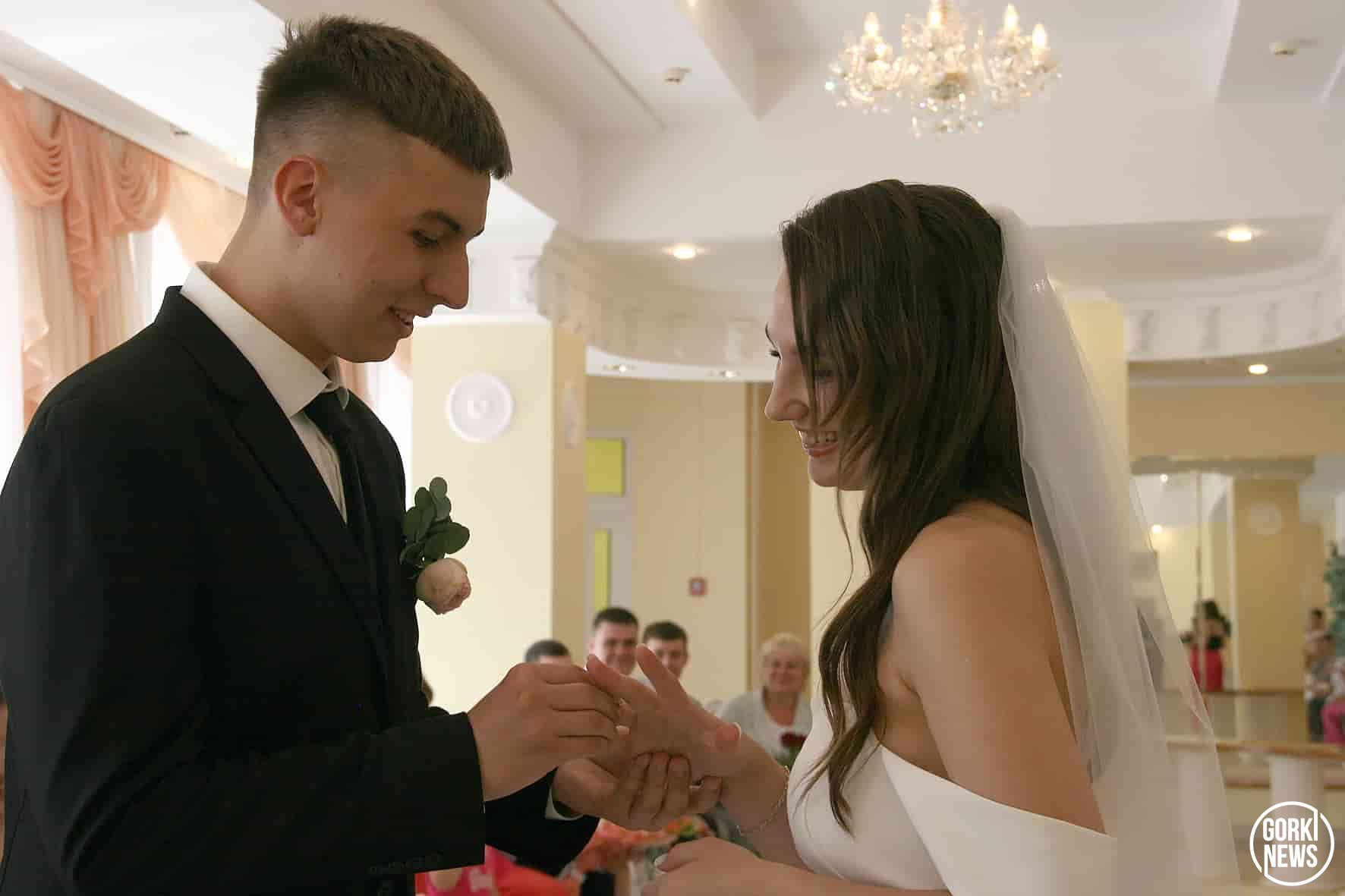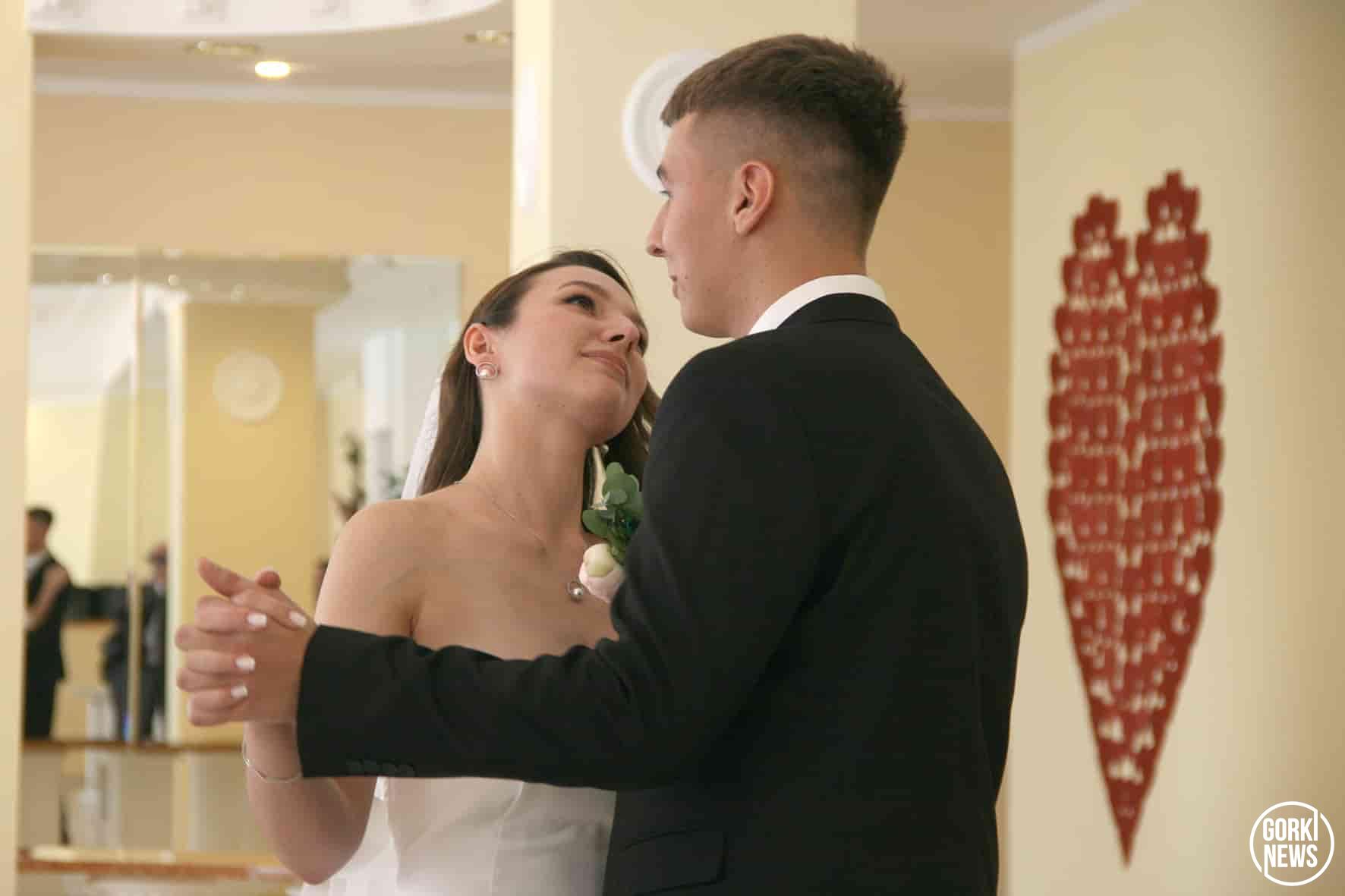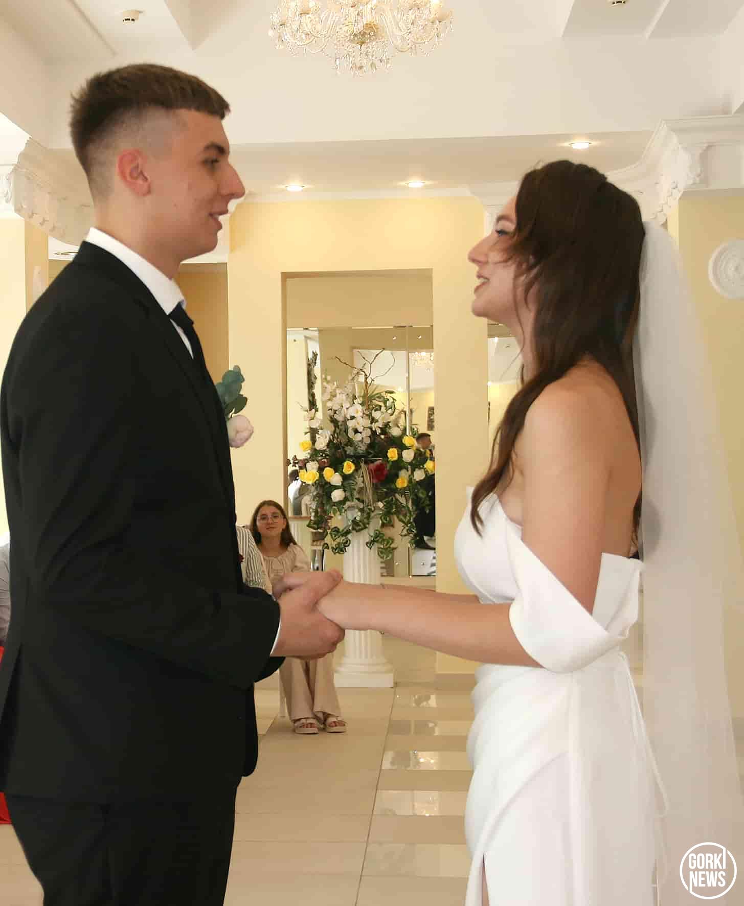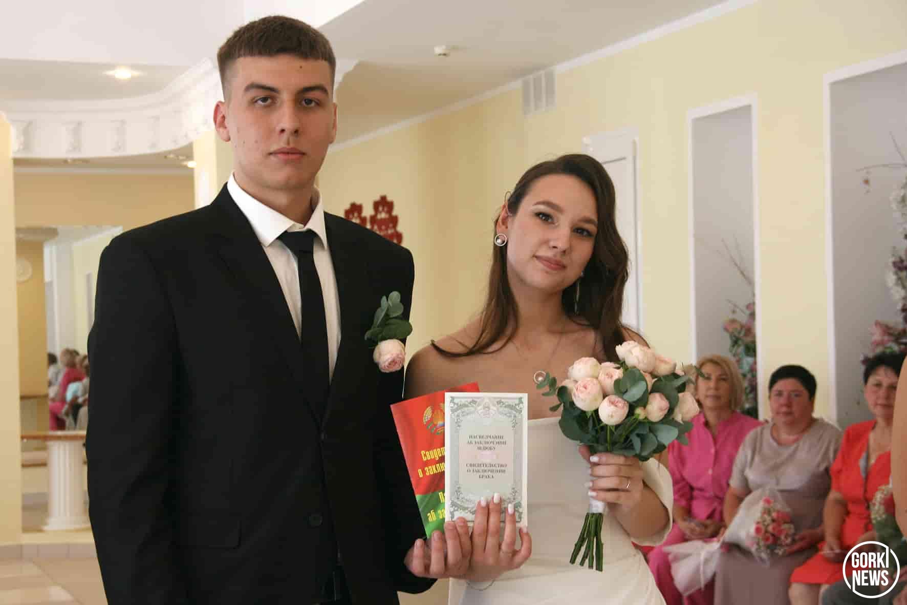 Юбилейная свадьба прошла сегодня в отделе ЗАГС райисполкома. Это сотая новая молодая семья в Горецком районе. Молодоженами стали Ярослав Кабашов и Ксения Цыркунова