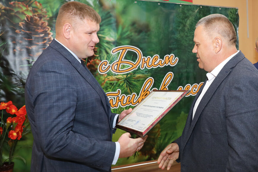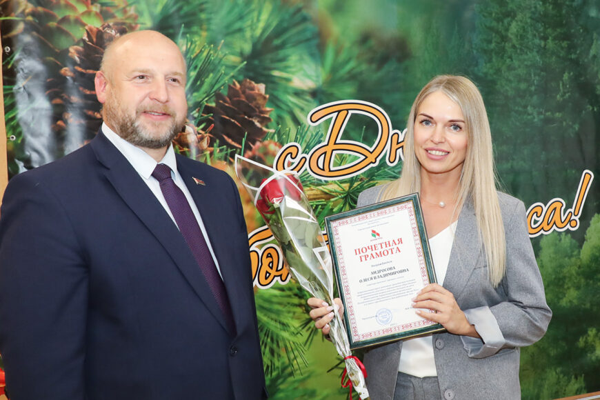 Максим Валентинович также поздравил работников и ветеранов с грядущим профессиональным праздником, отметил большой важный труд всего коллектива, что здесь работают неравнодушные и ответственные люди. Глава депутатского корпуса района вручил Почетные грамоты от РО РОО «Белая Русь» инженеру по лесопользованию Анне Лапко, инженеру по автоматизированным системам управления производством Игорю Лысяку, секретарю приемной Олесе Андросовой.