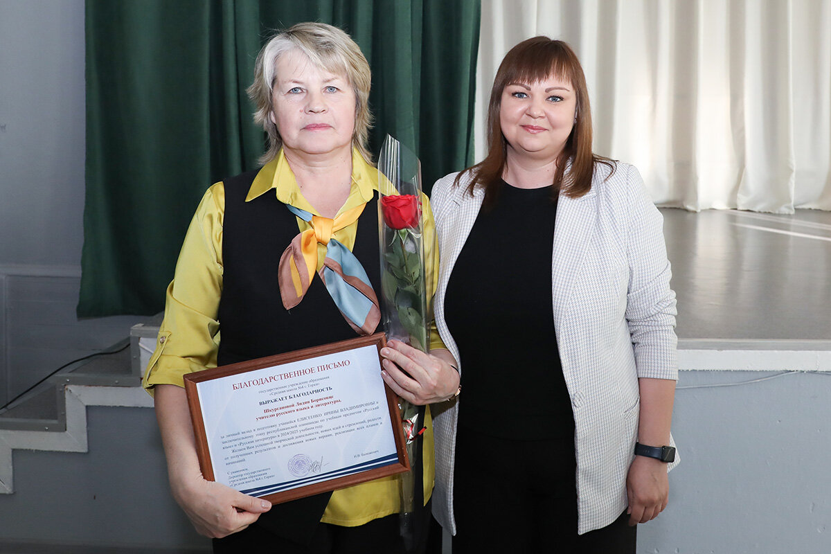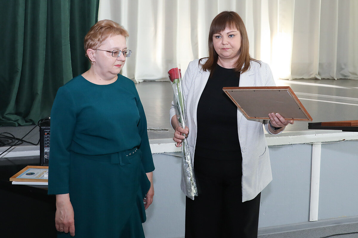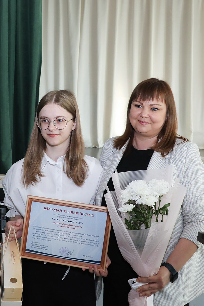 Директор школы Наталья Валюженич тепло поздравила Ирину и Владимира с их выдающимися результатами, вручила цветы, Благодарственные письма, большие коробки с конфетами, пожелав всегда уверенно идти вперед, навстречу новым знаниям, целям и победам, никогда не сворачивать с пути и верить в себя. Выдающийся успех ребят является заслугой их опытных учителей, которым Наталья Викторовна адресовала искренние слова поздравления. Цветы и Благодарственные письма из рук директора получили учитель русского языка и литературы Лидия Шкурганова и учитель истории Ольга Моисеенко, которым она пожелала успешной творческой деятельности, новых идей и стремлений и достижения новых вершин, реализации всех планов и начинаний.