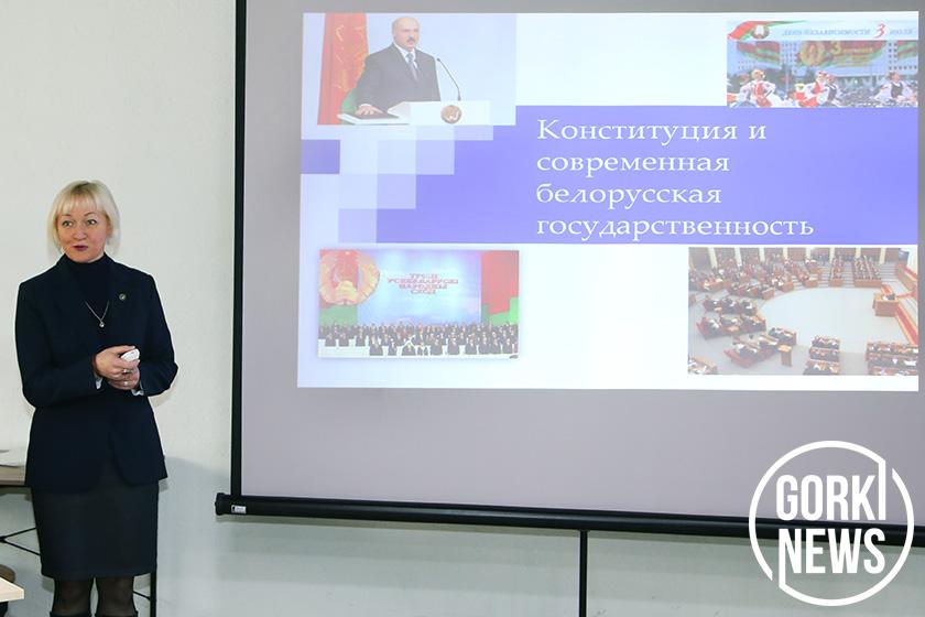 О Конституции, как о основополагающем документе Беларуси, рассказала заведующая кафедрой общепрофессиональных и специальных юридических дисциплин УО БГСХА Елена Лазарчук. Она провела исторический экскурс для аудитории о том, когда был принят первый Основной Закон государства, в каких годах он принимался и изменялся в советское и нынешнее время. Особое внимание Елена Адамовна акцентировала на нововведениях в последней редакции, для чего это было сделано.