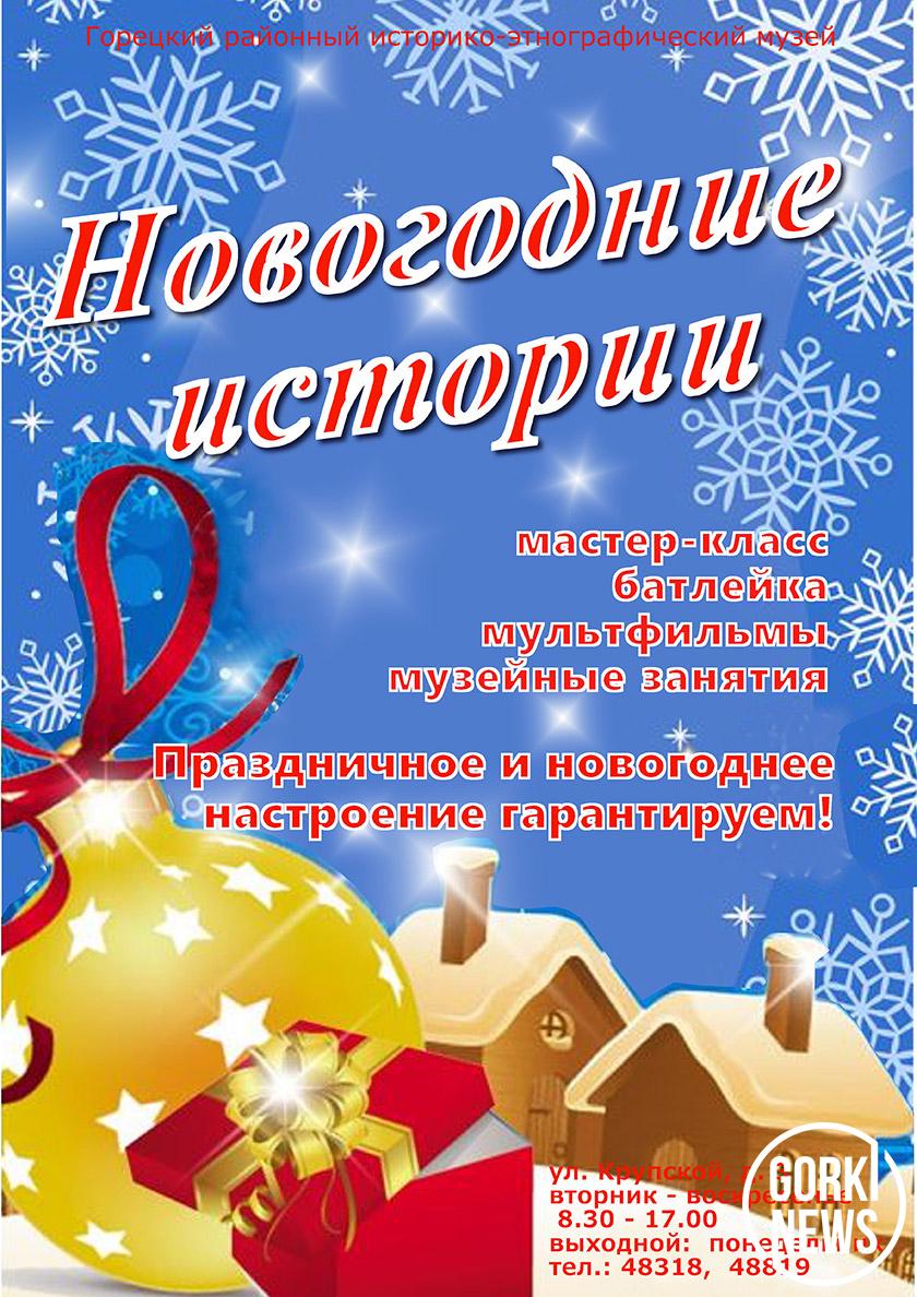 Во время новогодних каникул для детей в музее пройдут мастер-классы по вытинанке от преподавателя Горецкой районной детской школы искусств и художественных ремесел, носителя этого древнего народного искусства Елены Бруй, музейные занятия об истории празднования Нового года, о новогодних елках и открытках, а также просмотр тематических мультфильмов, которые были созданы в первой половине ХХ века, и представление студии батлеечных кукол «Дива» (сказка «Снегурочка»).